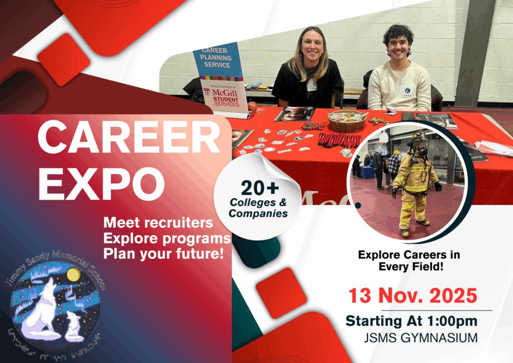 Students and community members are invited to the Career Expo at Jimmy Sandy Memorial School! This exciting event will take place on Thursday, November 13, 2025, starting at 1:00 p.m. in the JSMS Gymnasium.